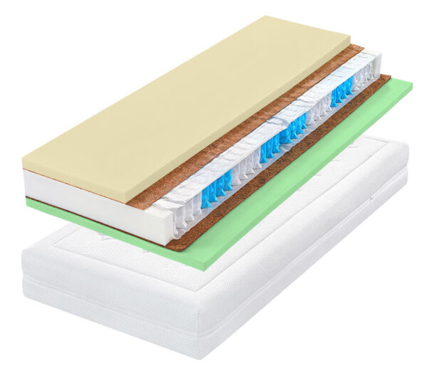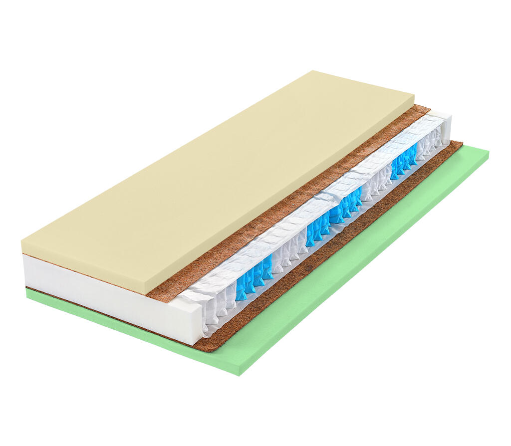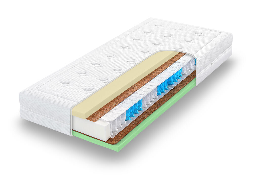 Kokosová deska. Roznášecí vrstva o výšce 1 cm (strana hard) a 0,5cm (strana soft) z lisovaného kokosového vlákna (100 %) dává matraci tuhost a odolnost.Potah wellnes (60 °C). Designově propracovaný potah s funkcí odvodu statického náboje pro hluboký spánek. Je velmi jemný a díky originálnímu prošití dobře drží tvar.