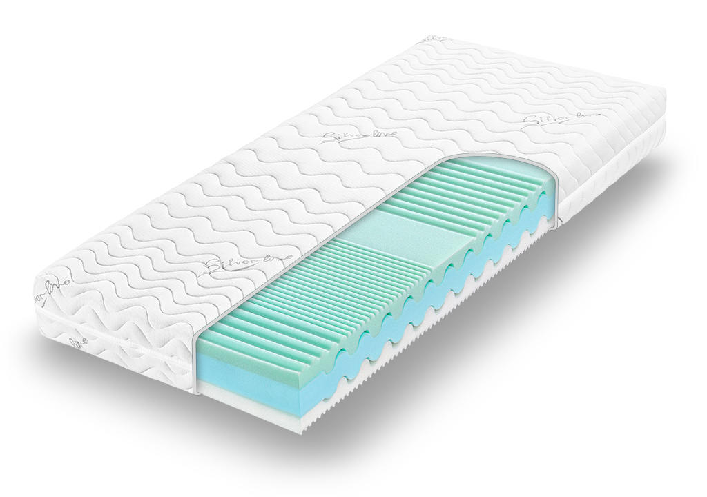 Potah Silver Line. Komfort & ventilace. Hygiena & praní na 60°C. Dvojdílná konstrukce pro snadnou manipulaci, klimatizační vrstvy pro odvod potu. Strana SOFT. 7 ortopedických zón. Dámy si zamilují. Nižší střední tuhost.
